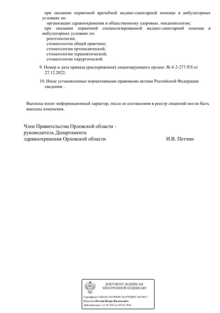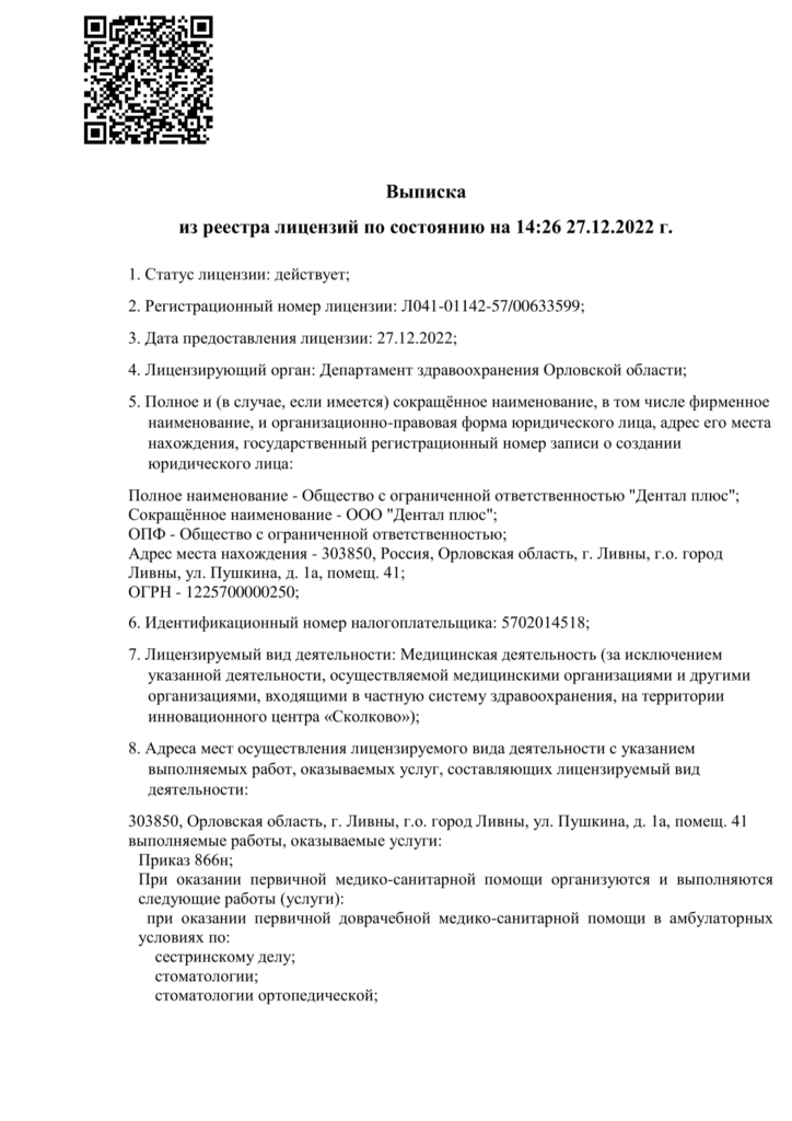 Лицензия № Л041-01142-57/00633599 выдана 27 декабря 2022г Департаментом здравоохранения Орловской области