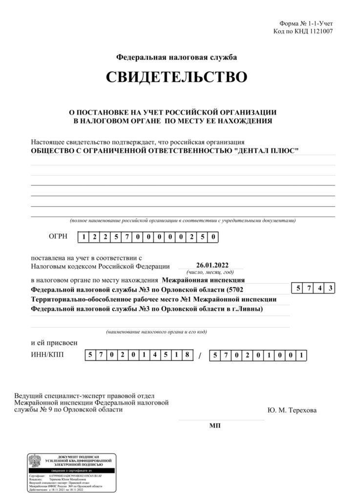 ОГРН 1 2 2 5 7 0 0 0 0 0 2 5 0, ИНН 5702014518/КПП 570201001